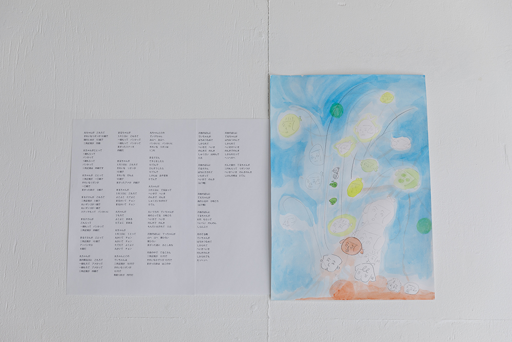 ドローイング(紙に鉛筆、ペン、アクリル絵の具)、みかんの皮、テキスト