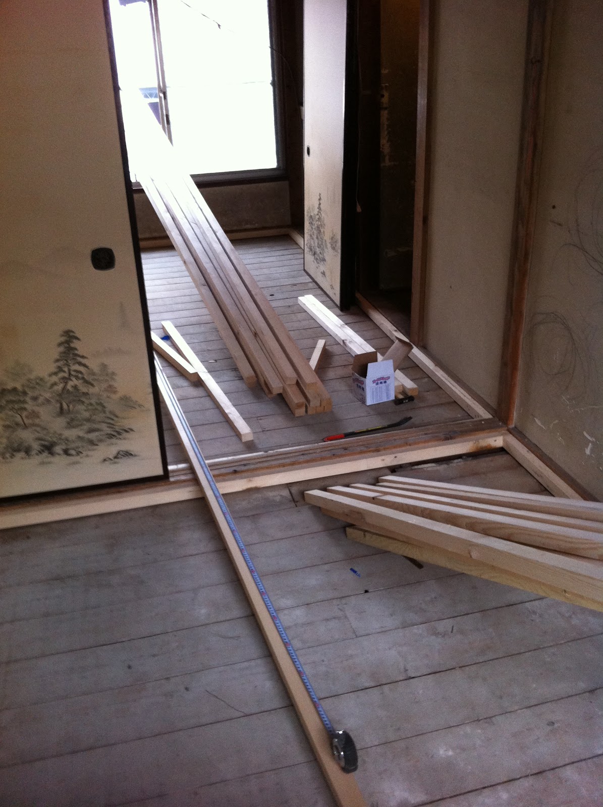 前回の作業で畳をはずした二階の床に、角材を運びました。